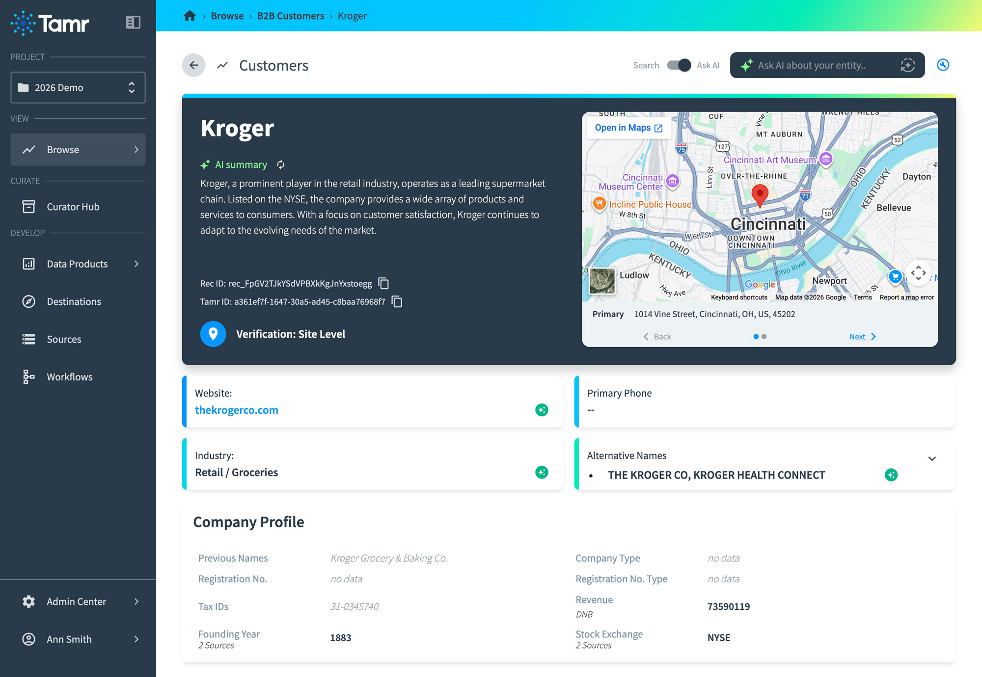 Match your customer records against Tamr’s vast corpus of firmographic data to improve matching accuracy. Validate each record to confirm that it represents a real, existing corporate entity, ensuring the integrity of your customer data.